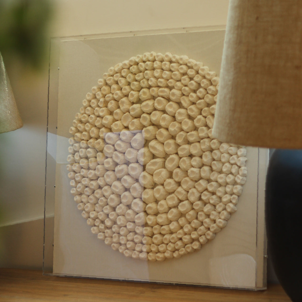 Dale vida a tus espacios con el Cuadro “Círculo de Texturas” , una pieza decorativa de 80×80 cm creada artesanalmente a partir de papel hecho a mano con corteza de árbol 100 % natural y biodegradable. Su composición circular en relieve está cuidadosamente formada por cápsulas texturadas que generan un efecto visual tridimensional cautivador.