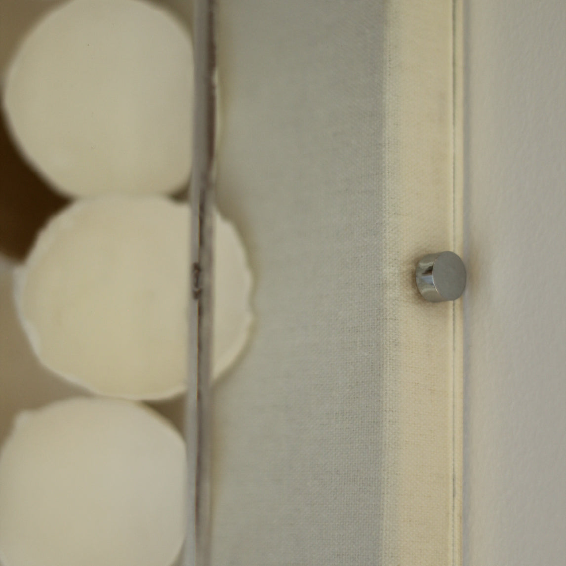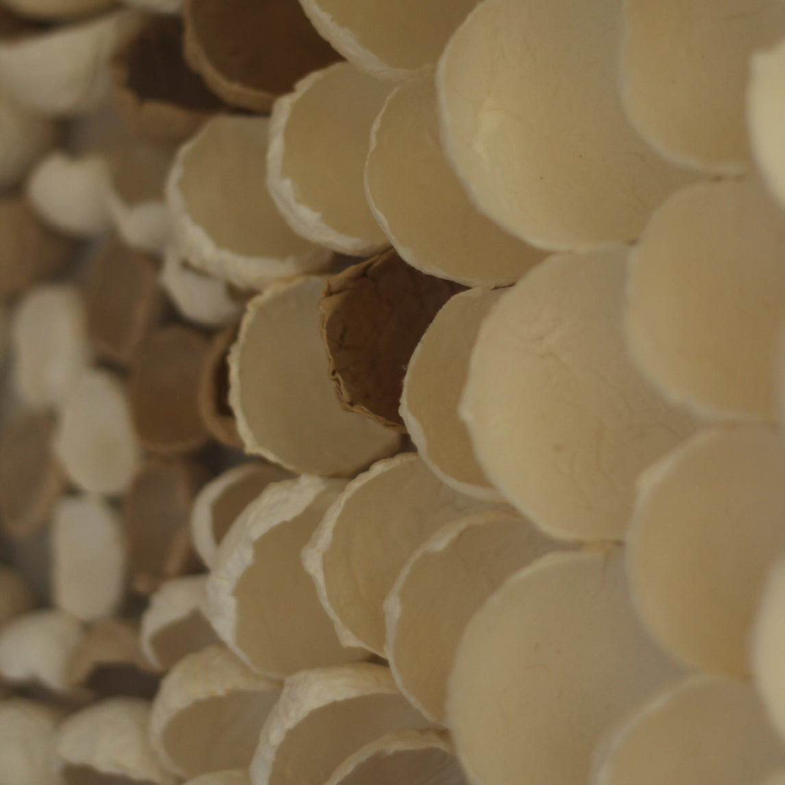 Cada elemento es moldeado a mano, conservando las marcas únicas del papel natural. Montado sobre bastidor de lino y protegido por una caja de acrílico transparente, este cuadro refleja elegancia y consciencia ecológica, ideal para ambientes serenos, modernos o espirituales ✨🖼️