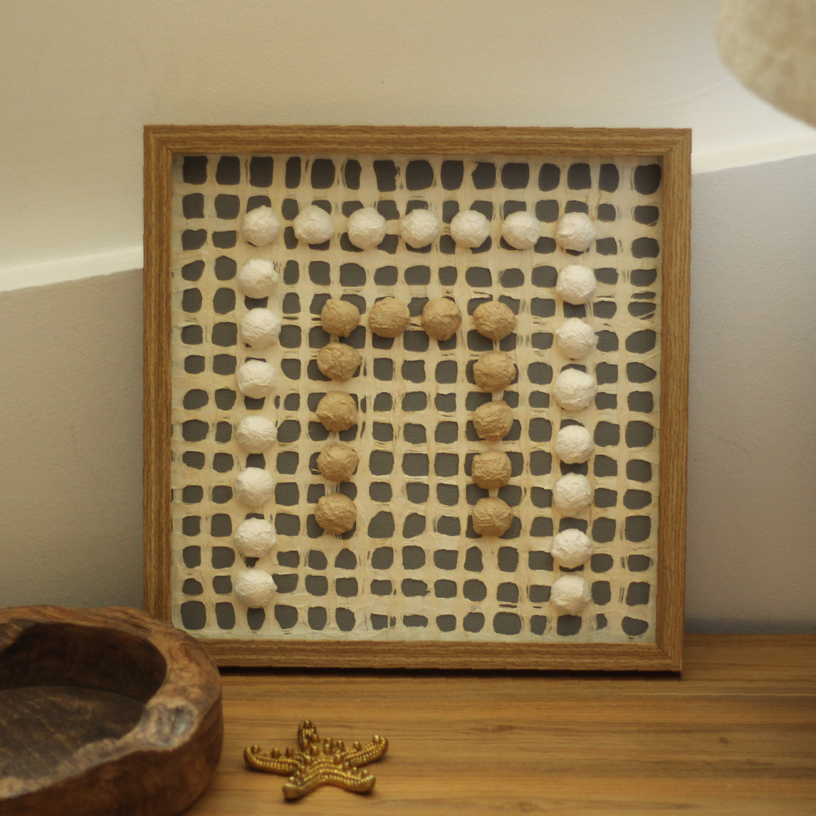 Transforma tus espacios con el Cuadro Puntos de Equilibrio,40X40 una pieza de arte decorativa hecha completamente a mano con papel natural elaborado con una técnica ancestral . Esta obra combina copos de papel texturizado en tonos crudo y tierra dispuestos sobre una red geométrica que evoca balance, ritmo y conexión con la naturaleza. Su estética neutra y minimalista lo hace ideal para ambientes modernos, rústicos o escandinavos. Enmarcado en madera natural, cada pieza es única y sostenible. ♻️🖼️