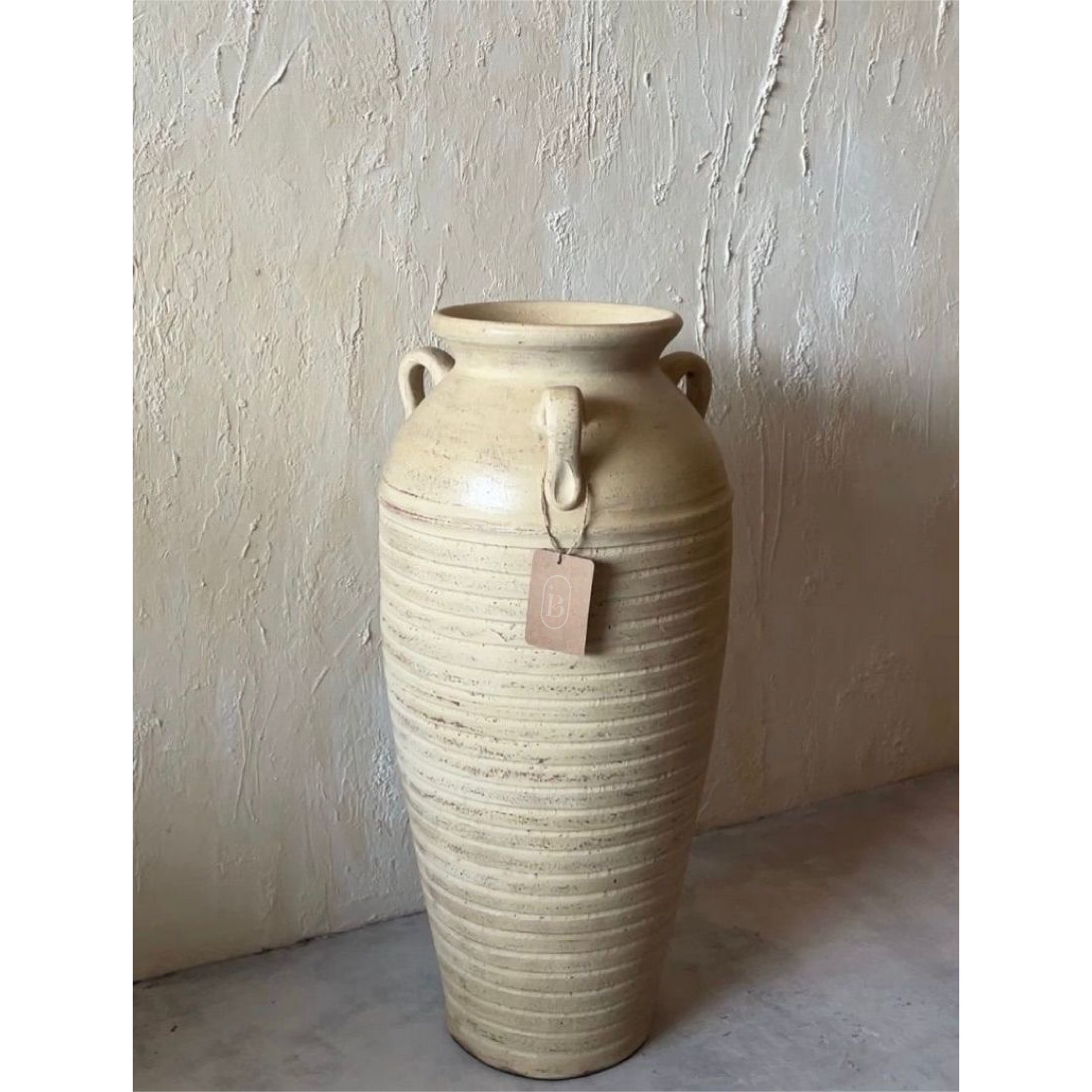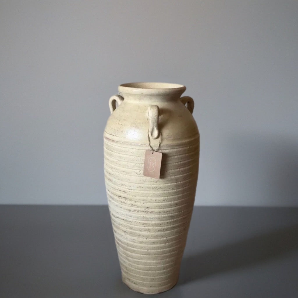 El Jarrón Puthi es una pieza artesanal única, elaborada 100% a mano en terracota, con un acabado en pátina beige rústico que realza su belleza natural. Su forma estilizada con asas decorativas y textura acanalada lo convierten en un elemento decorativo que aporta elegancia, tradición y personalidad a cualquier espacio, tanto interior como exterior.