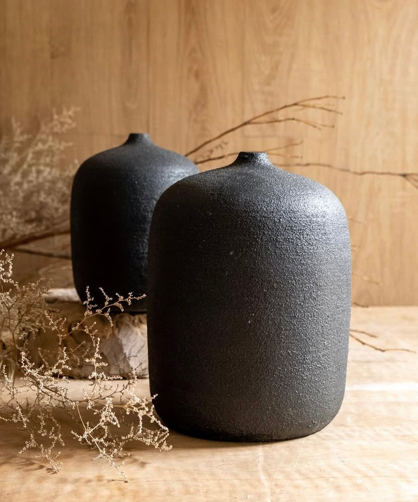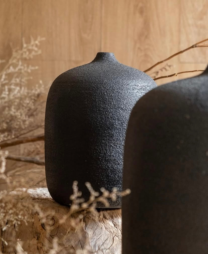 El Jarrón Black Bottle es una pieza artesanal fabricada 100% a mano en terracota, con un acabado mate y textura natural que aporta sobriedad y sofisticación a cualquier espacio. Su diseño minimalista y color negro profundo lo convierten en un elemento decorativo versátil, ideal para realzar ambientes contemporáneos, rústicos o de estilo wabi-sabi.