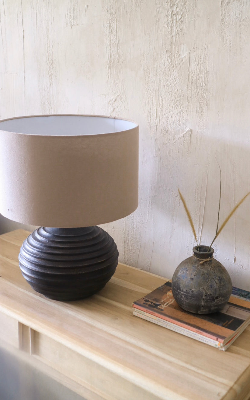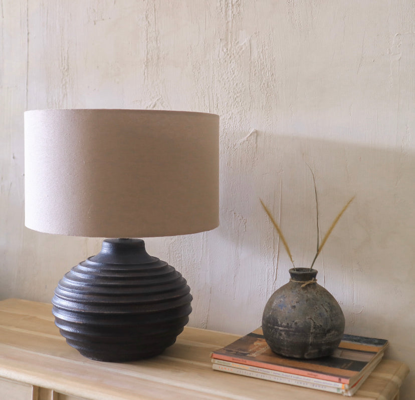 Base de cerámica terracota con pátina negra envejecida + pantalla de yute color crudo