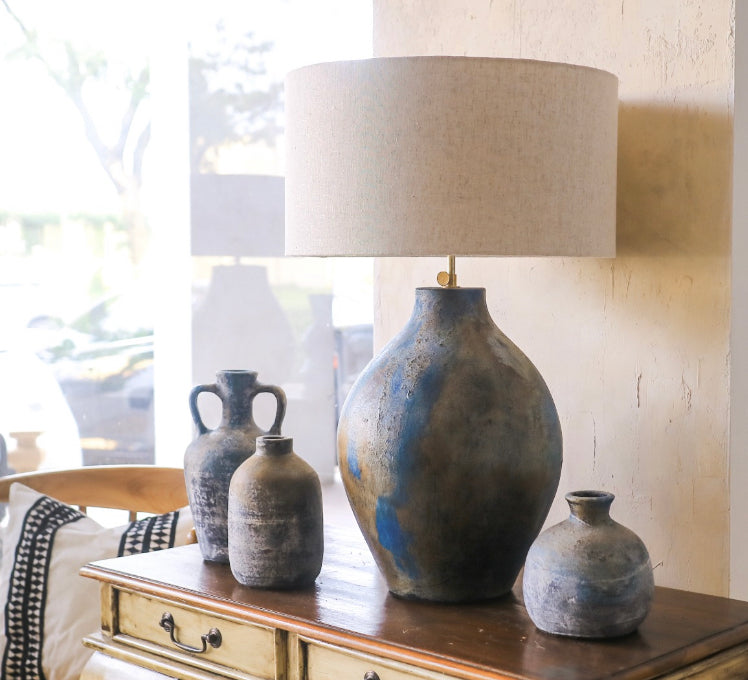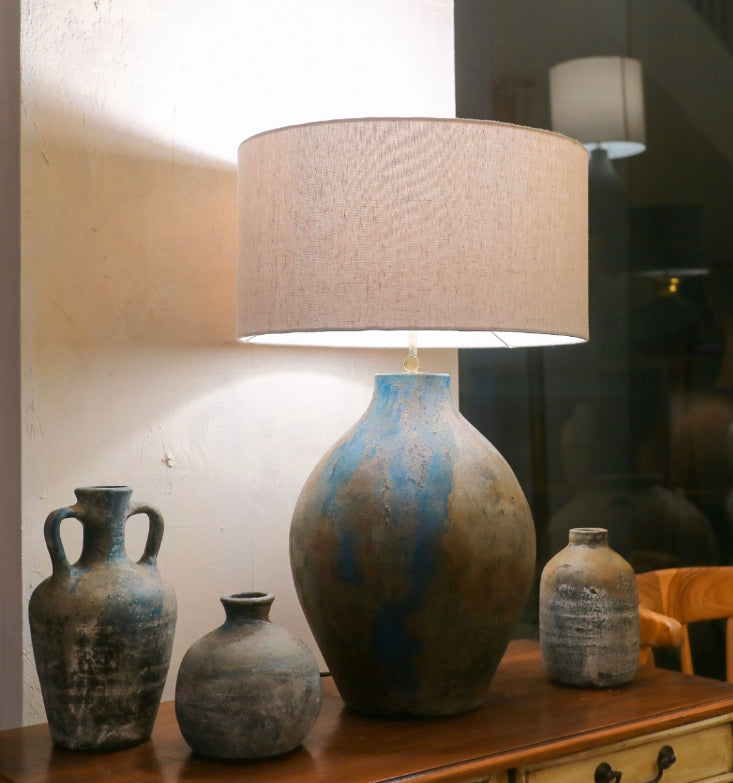 Base de cerámica terracota con pátina envejecida en tonos azulinos y tierra + pantalla de yute beige