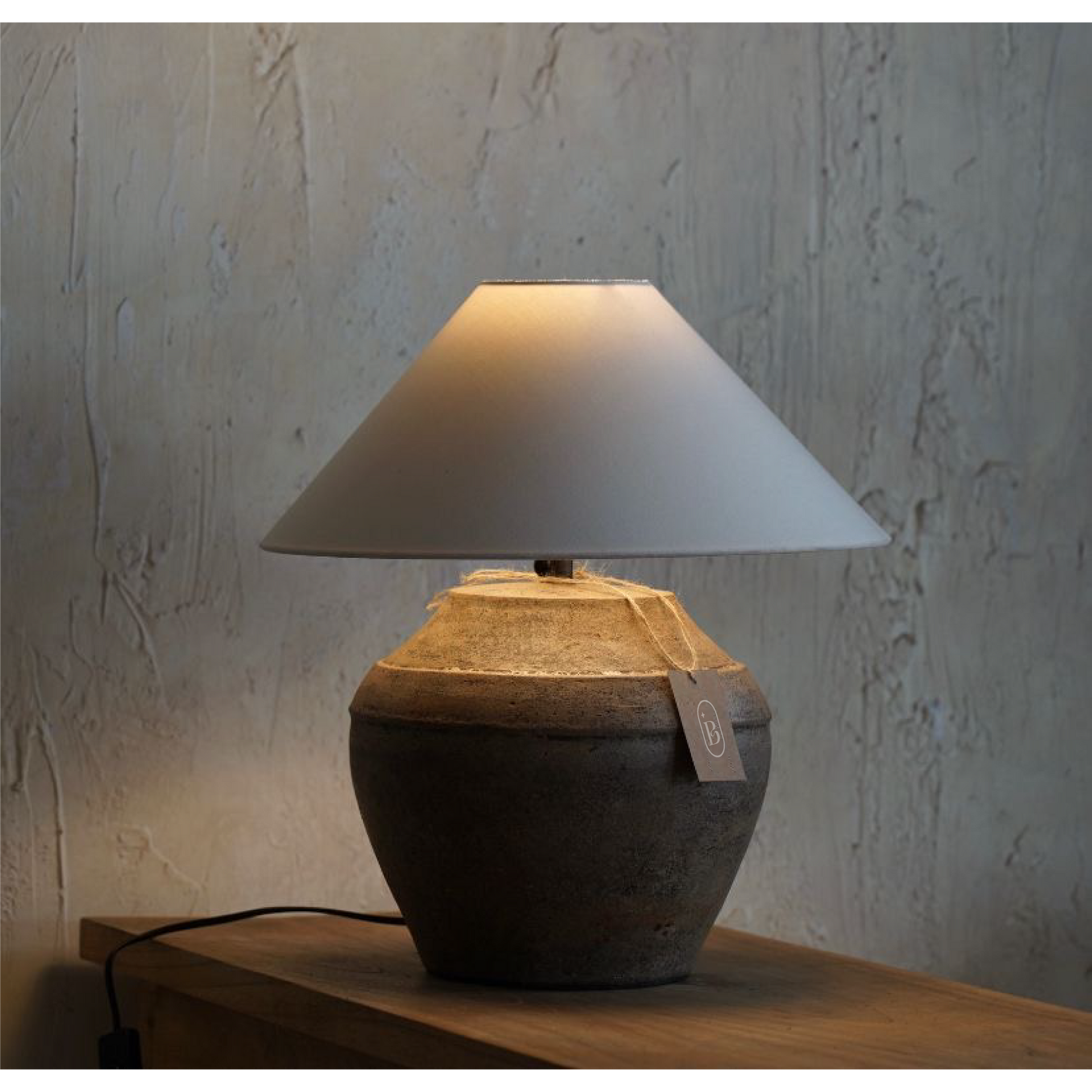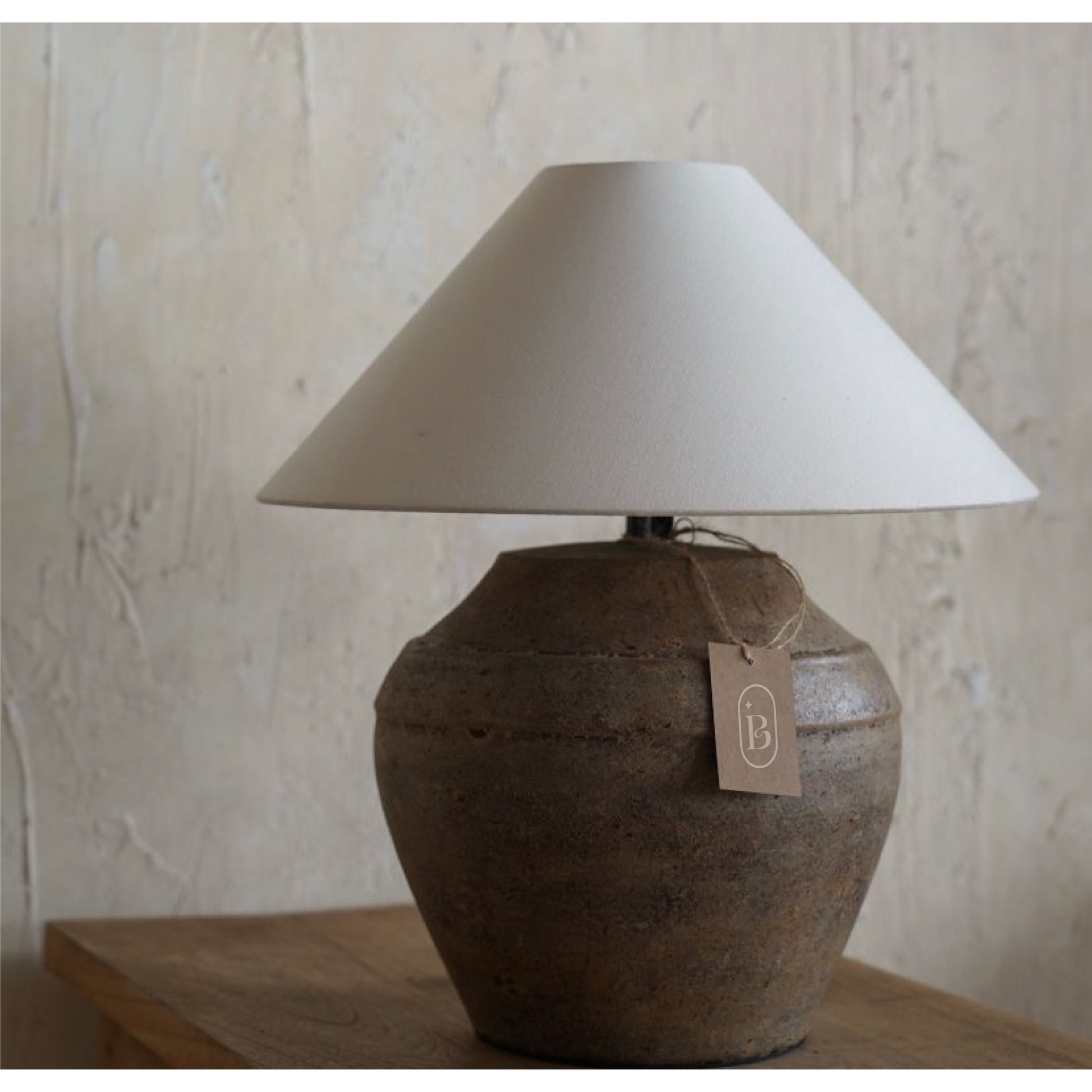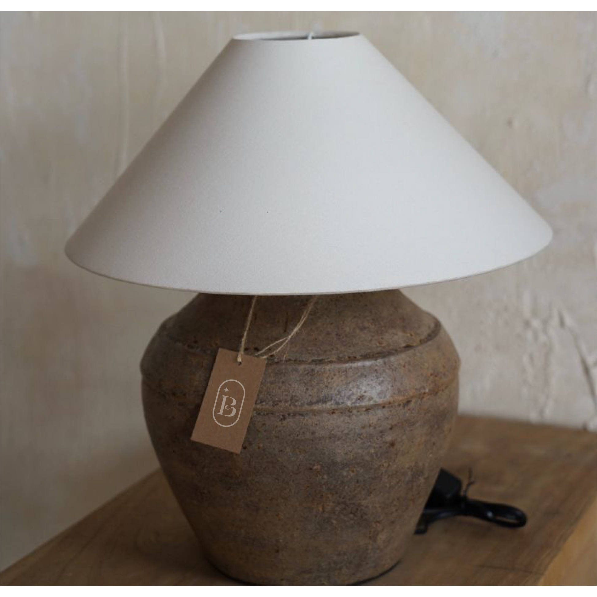 Base de cerámica terracota con pátina envejecida + pantalla de yute beige