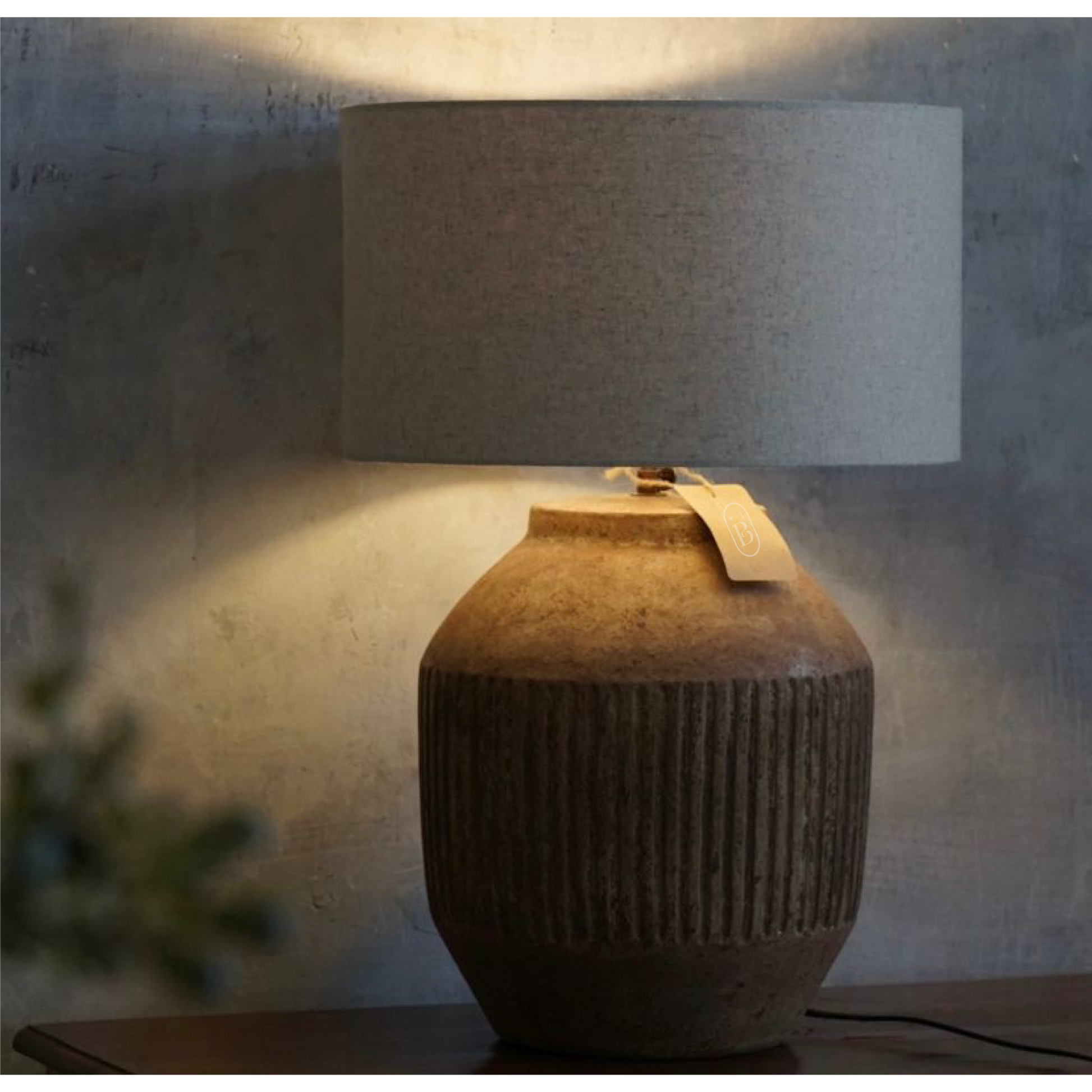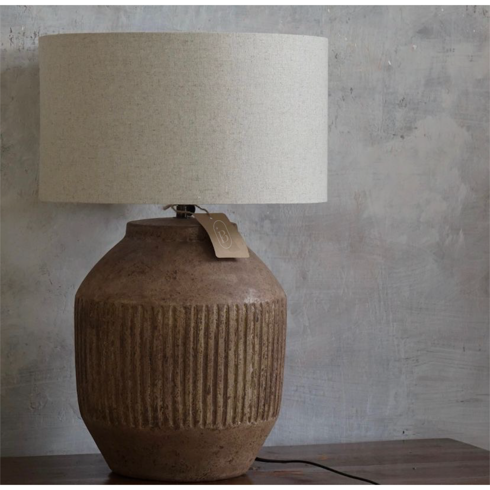 Base de terracota artesanal con pátina en tono barquillo envejecido + pantalla de yute beige