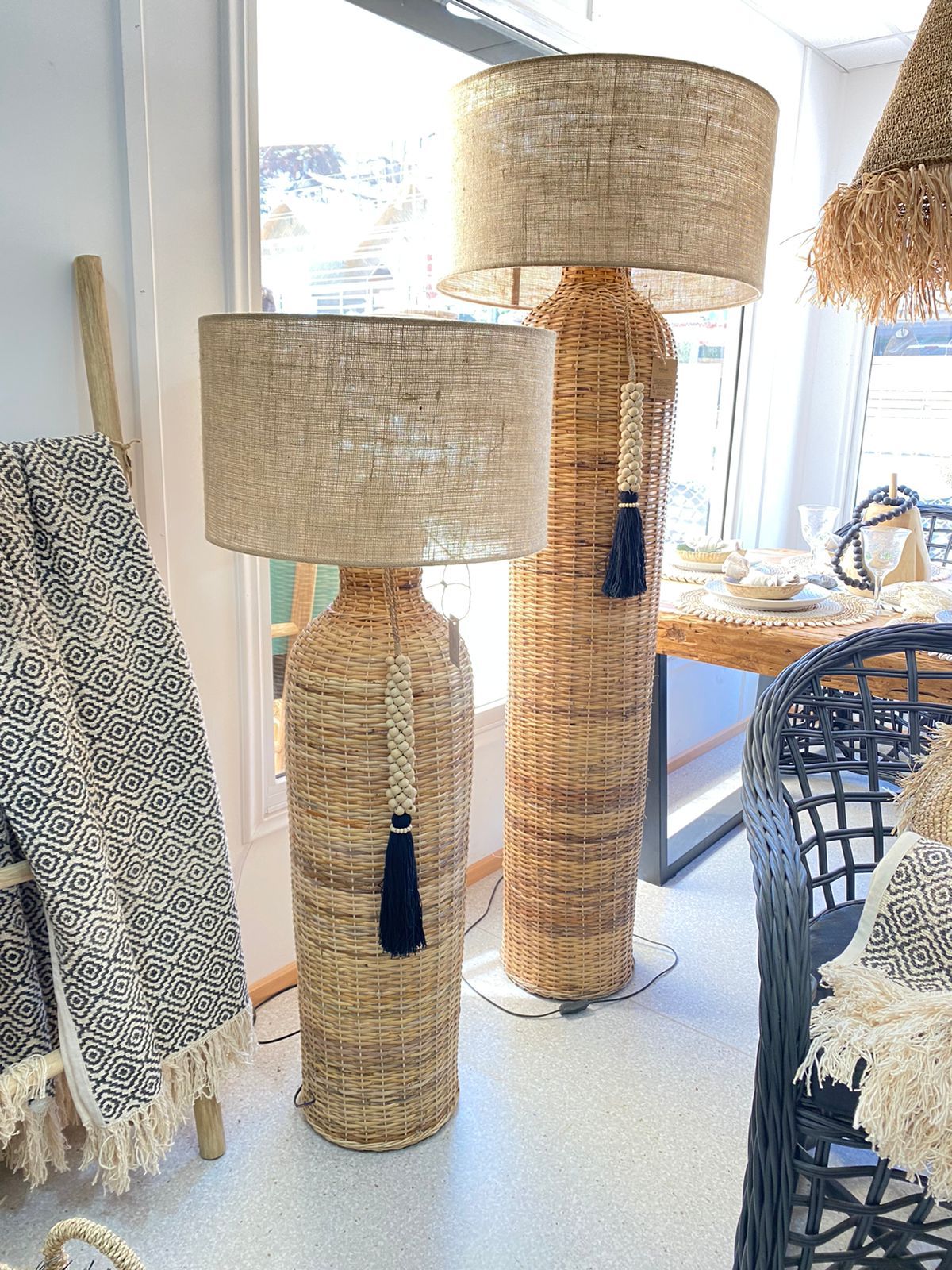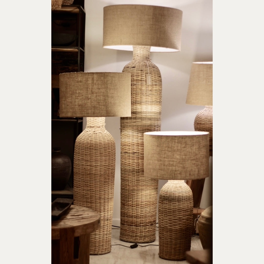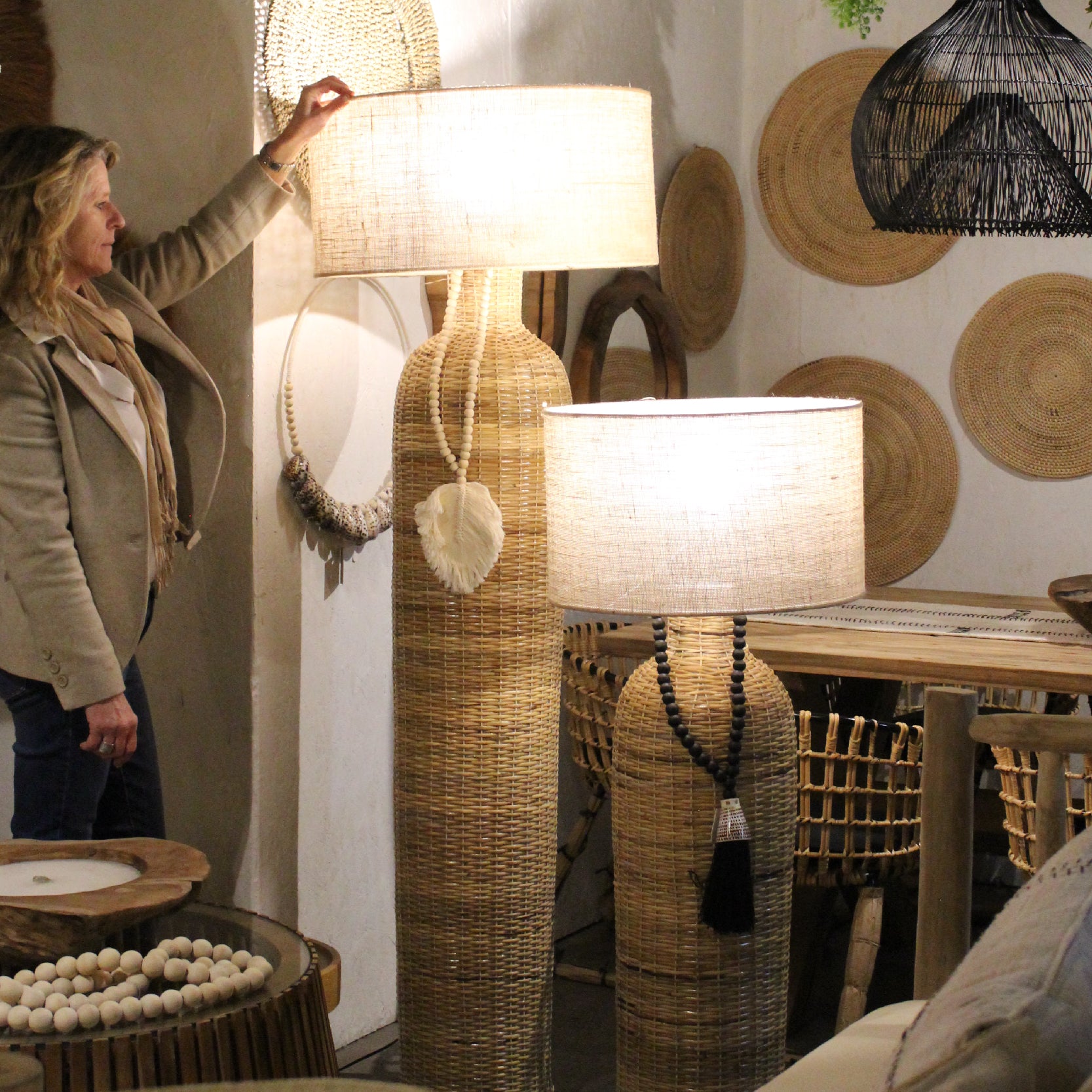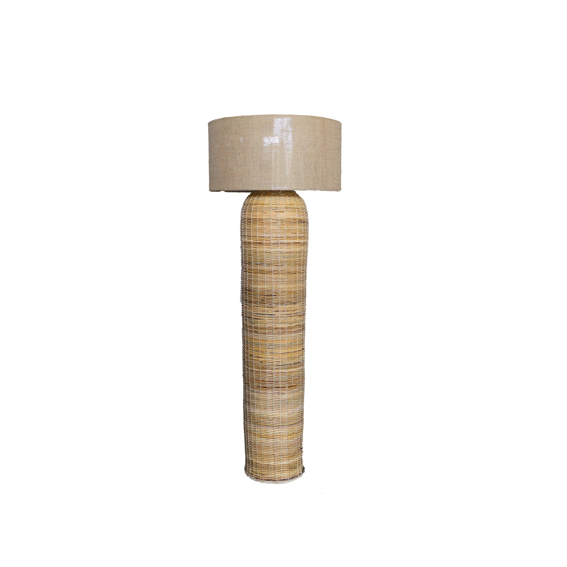 La Lámpara de Pie Jimbara es una pieza artesanal que combina una base de cerámica recubierta en ratán tejido a mano con una pantalla de arpillera natural. Su silueta alargada y acabados orgánicos aportan calidez, textura y un toque bohemio a cualquier espacio. Ideal para transformar salas, dormitorios o rincones de lectura en ambientes acogedores y con carácter.