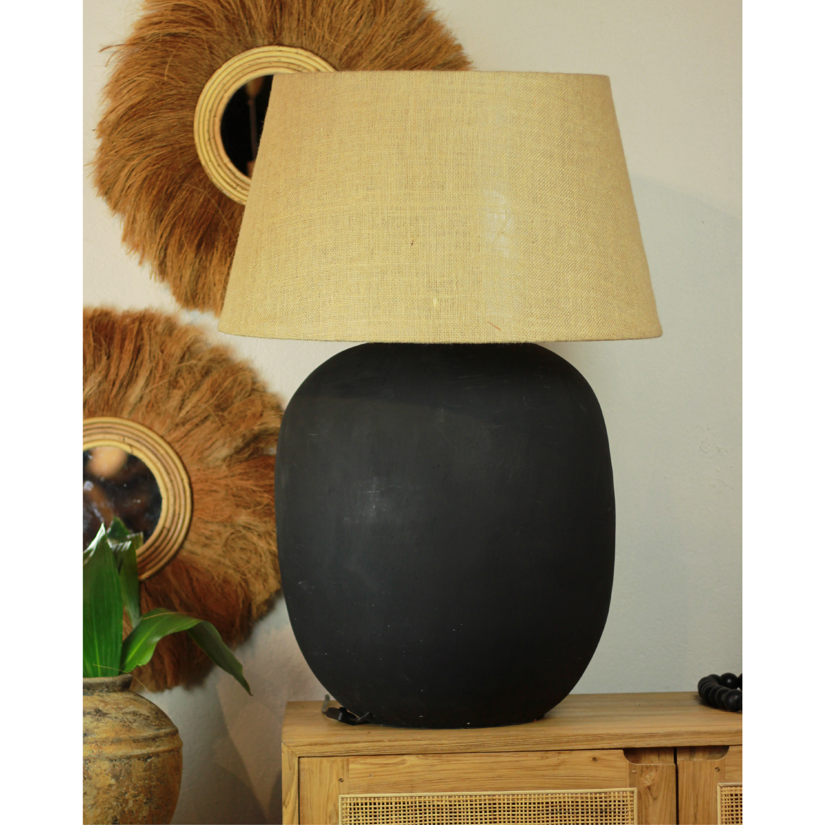 Base de terracota artesanal con acabado negro mate + pantalla de yute beige
