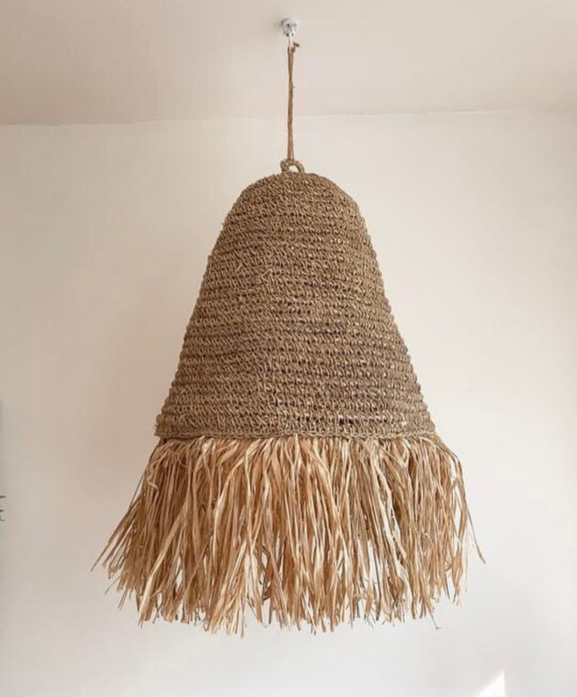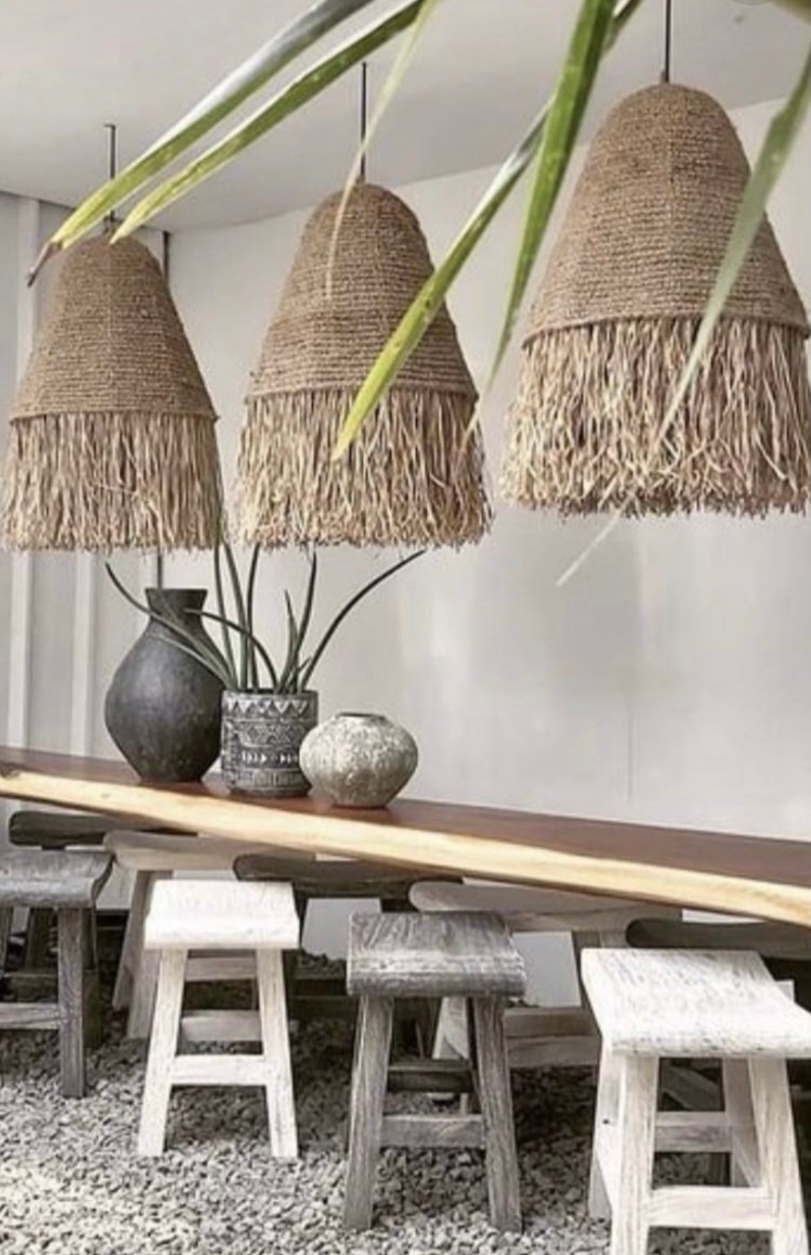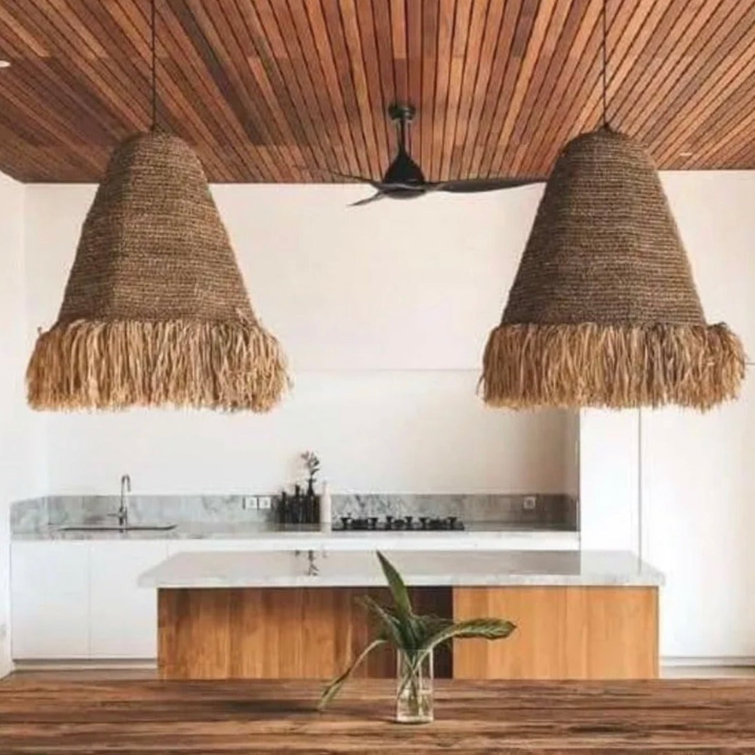 Ilumina tus espacios con la encantadora Pantalla Colgante Rajut, una obra artesanal hecha a mano con fibra natural de seagrass y flecos de rafia. Su diseño cónico con textura tejida aporta un aire bohemio, cálido y acogedor a cualquier ambiente. Ideal para colgar en comedores, terrazas techadas, salones o incluso negocios de estilo tropical, su estética natural eleva la decoración con un toque auténtico de Bali. Al ser elaboradas a mano, cada pantalla es única, lo que garantiza personalidad y originalidad en tu decoración. 💡🌾