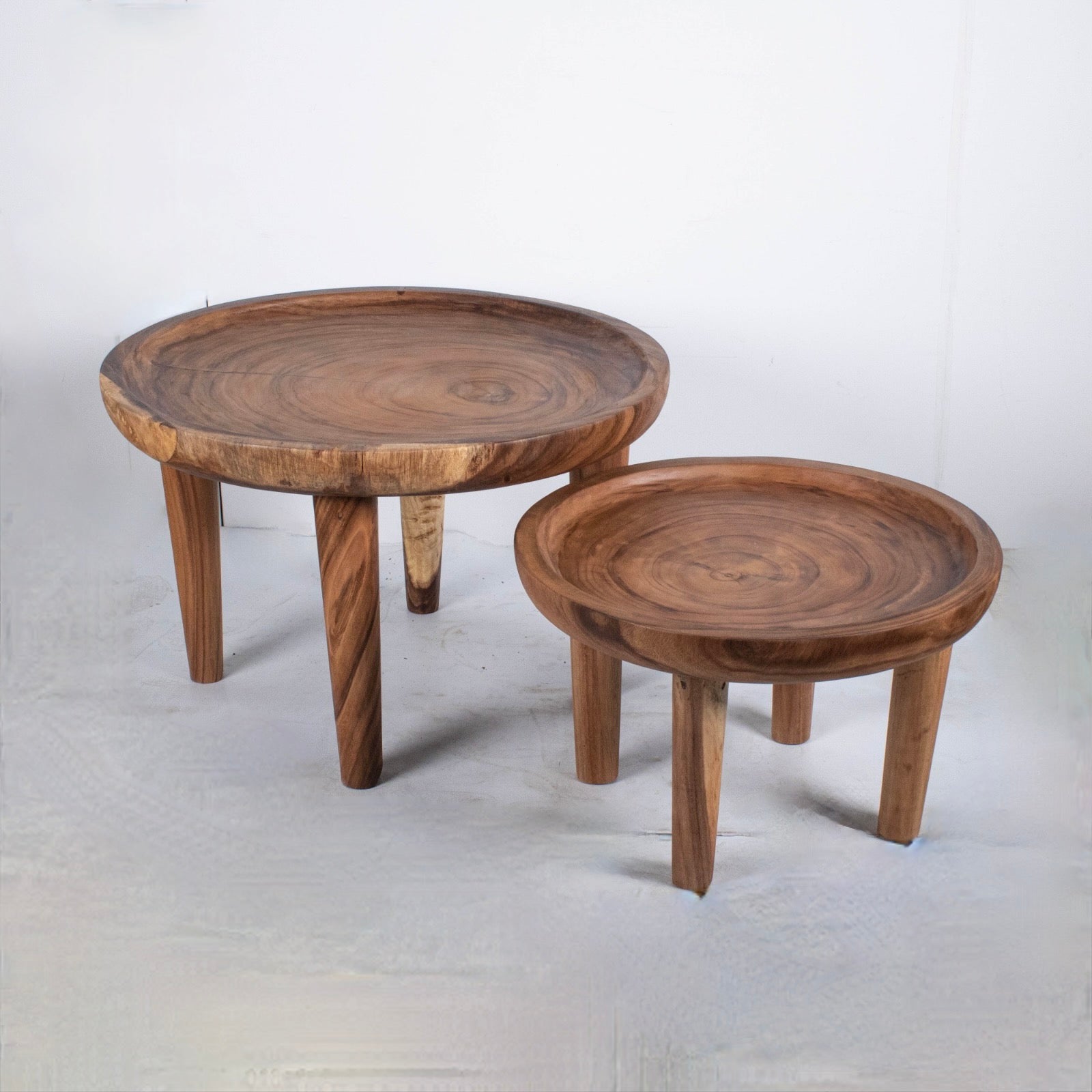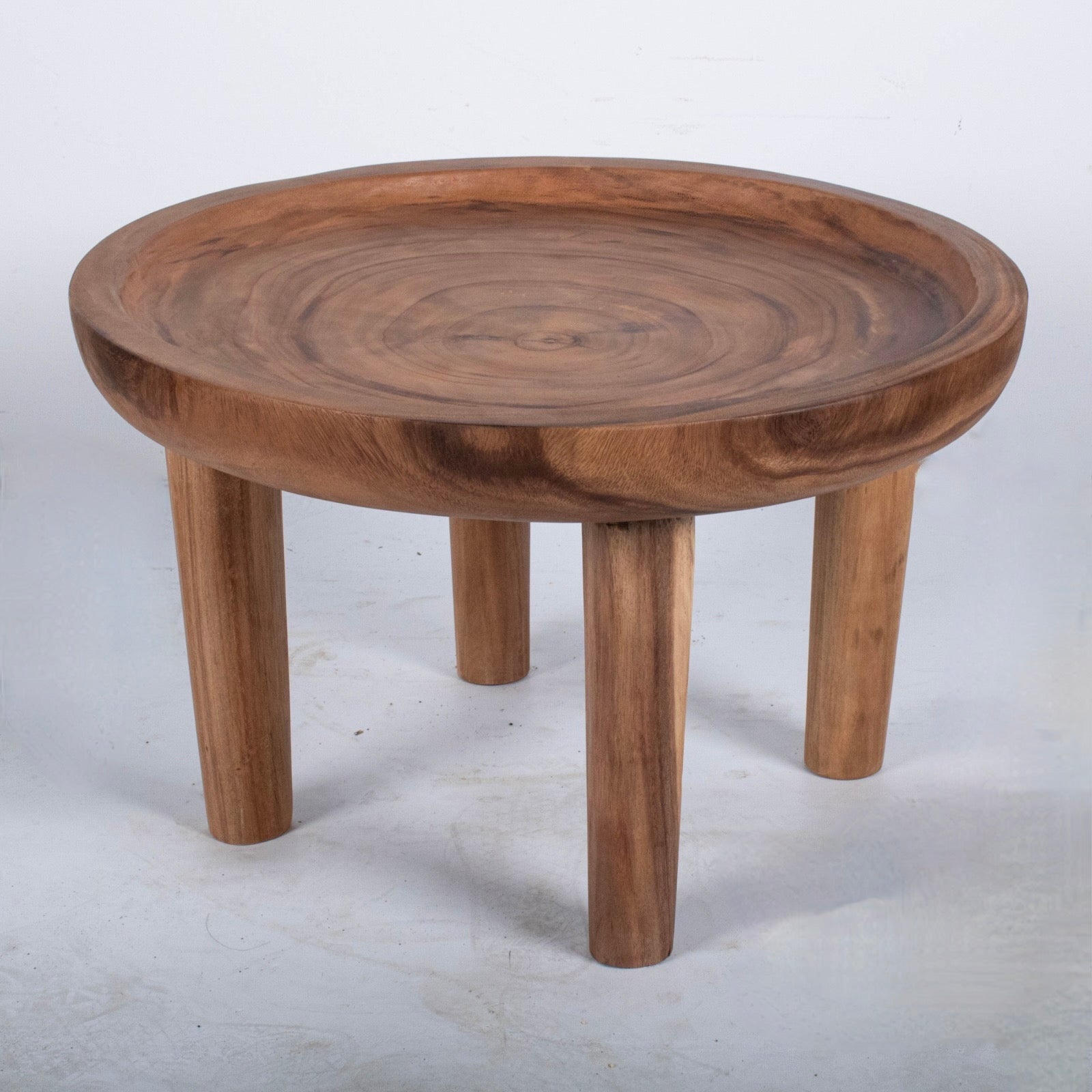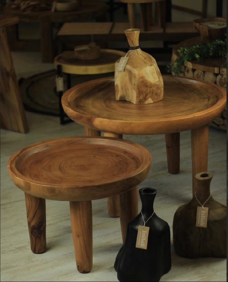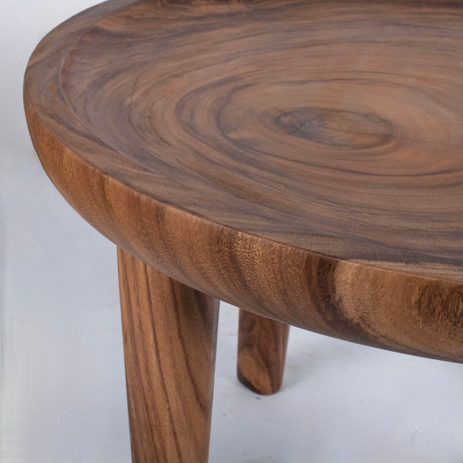 🎨 Diseño: Forma circular simple, con superficie lisa y vetas naturales que aportan carácter y calidez visual. La estructura robusta mantiene su funcionalidad de manera elegante.