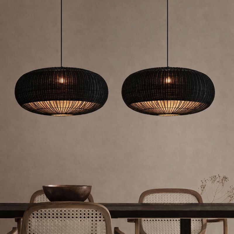 Haz de tu hogar un espacio lleno de arte y calidez con la Pantalla Bang black. Tejida cuidadosamente a mano por artesanos en Indonesia, esta lámpara colgante destaca por su diseño dinámico y su tejido ligero en ratán natural. Su forma ovalada, proyectando una luz cálida y suave que transforma cualquier ambiente en un refugio lleno de estilo 🌾✨