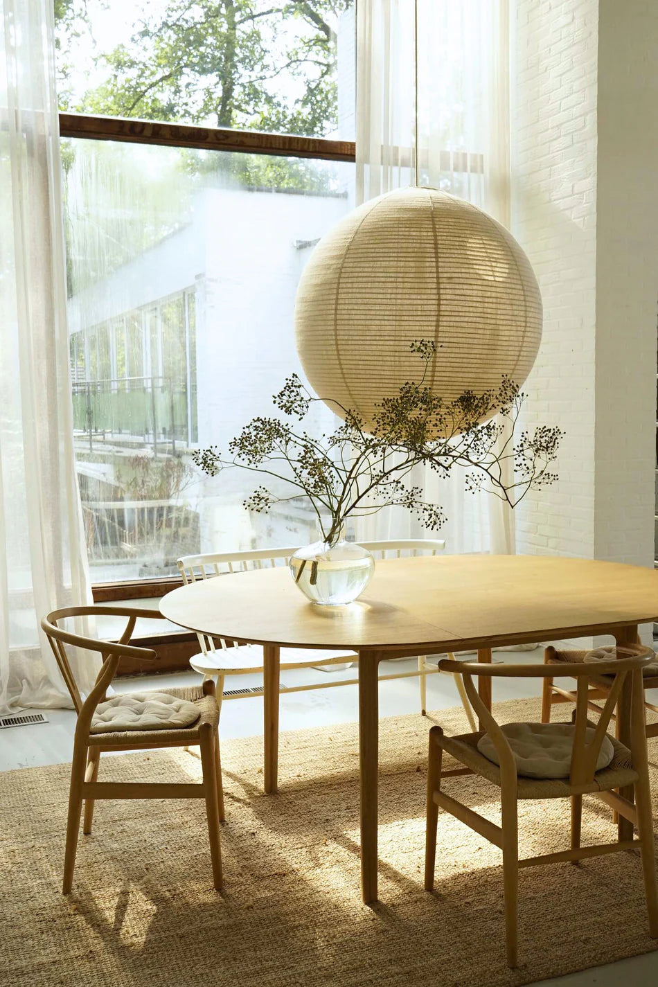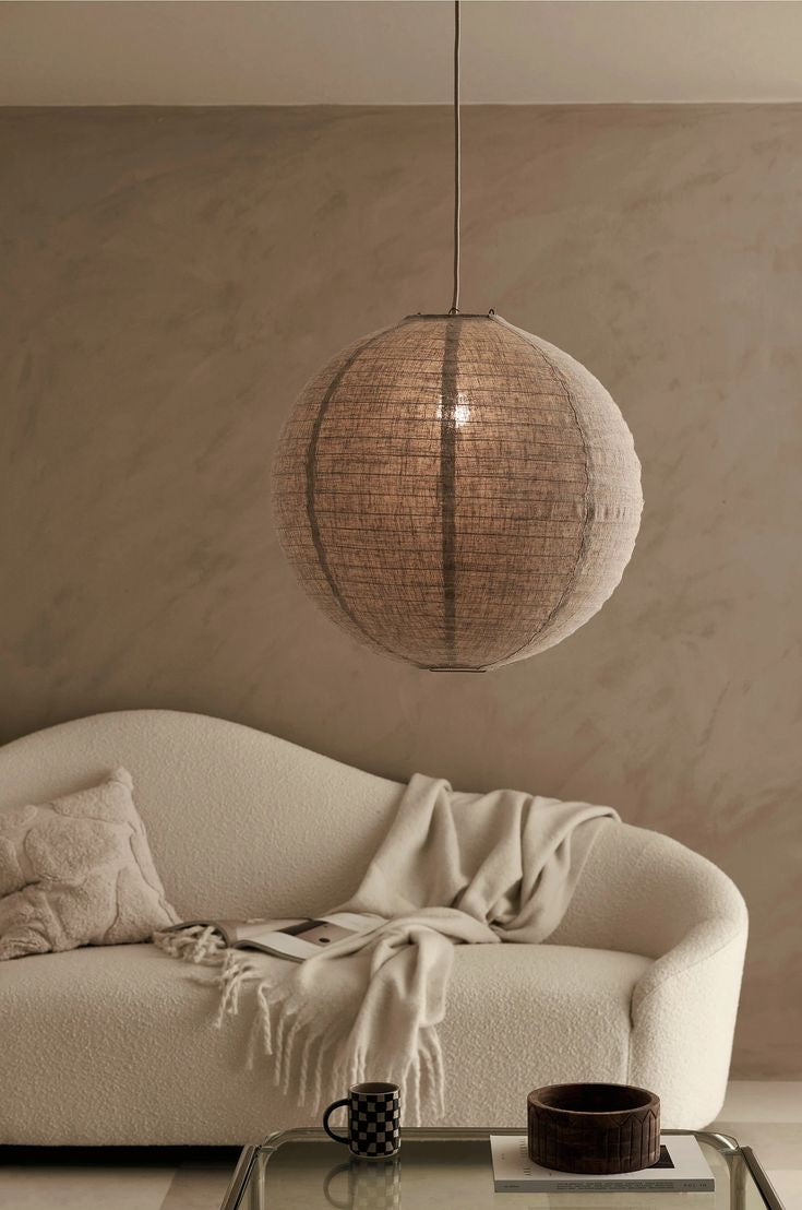 🎨 Diseño: Esfera perfecta en lino crudo que suaviza la iluminación y aporta una estética minimalista y atemporal.
